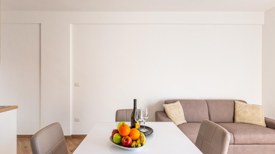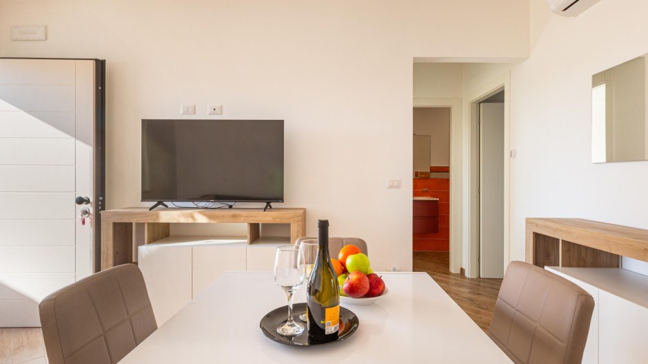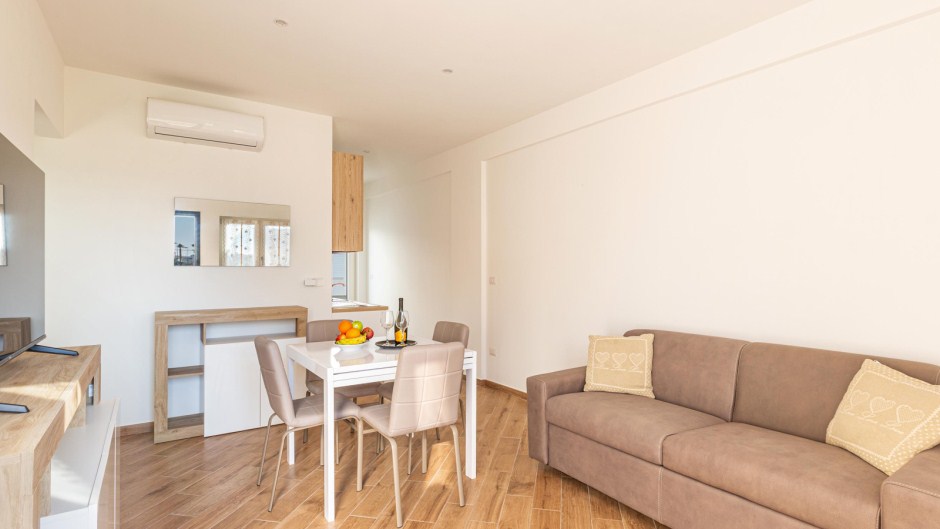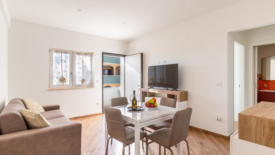 L'ingresso conduce direttamente al luminoso soggiorno, arredato con una sala da pranzo e un comodo divano letto matrimoniale, perfetto per rilassarsi dopo una giornata di sole e mare. La cucina è completamente attrezzata con piano cottura a induzione e tutti gli utensili necessari per preparare deliziose pietanze.