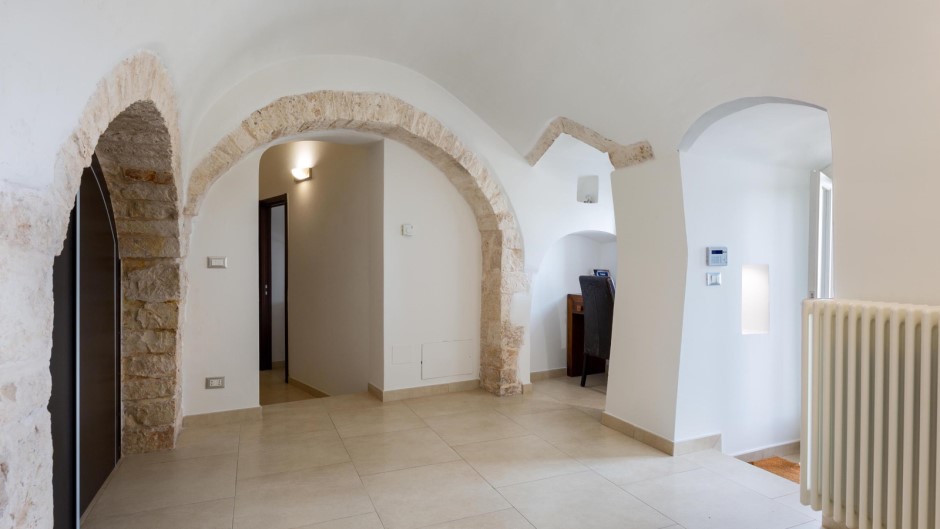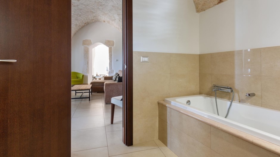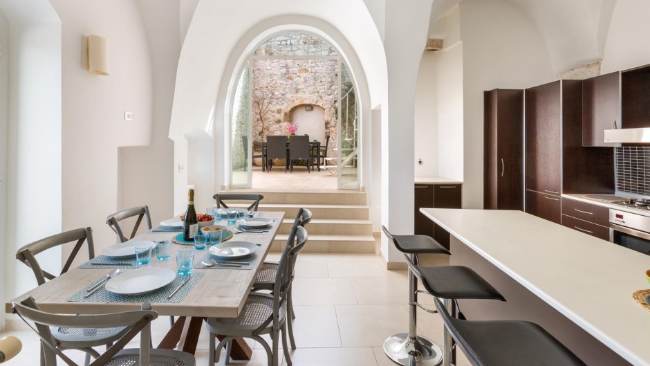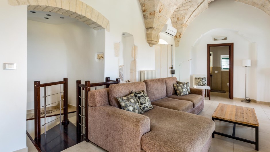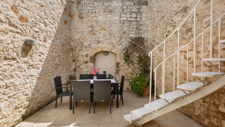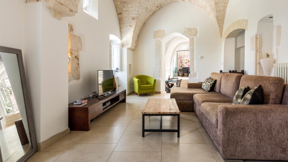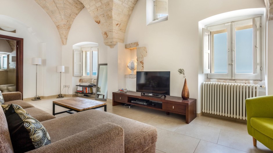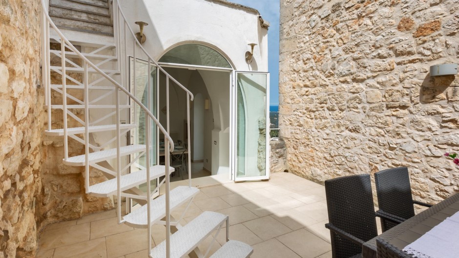 Su due piani con due ingressi separati, la Casa degli Amici si apre su un ampio e accogliente soggiorno con suggestive volte a stella e pietre a vista, completato da un comodo divano e una TV a schermo piatto. Una moderna cucina completamente attrezzata e un balcone con vista sulla città permettono di preparare e gustare pasti deliziosi mentre ci si gode il panorama. All'esterno, un terrazzo solarium arredato con sdraio, poltrone e doccia esterna offre un luogo ideale per rilassarsi e prendere il sole, mentre un barbecue permette di organizzare grigliate in compagnia.
