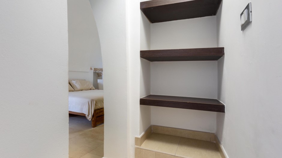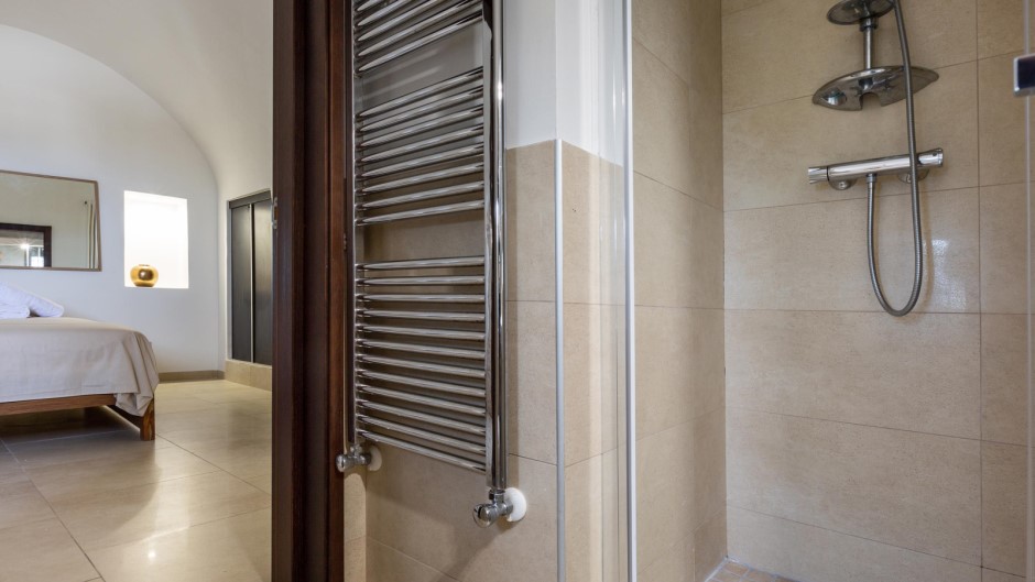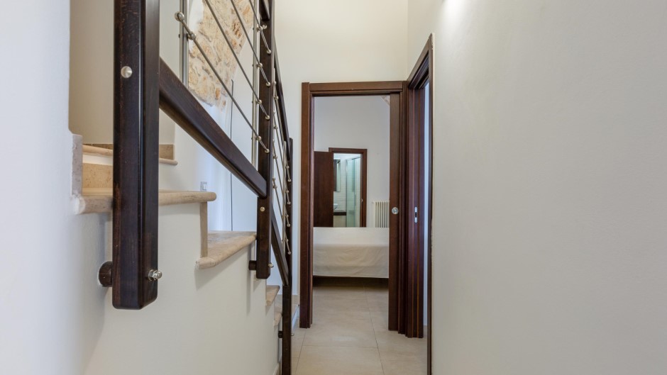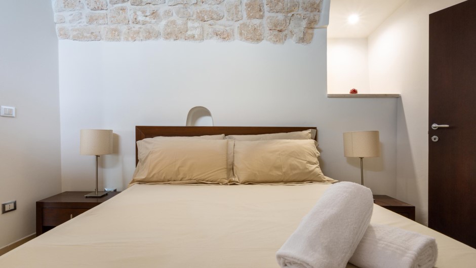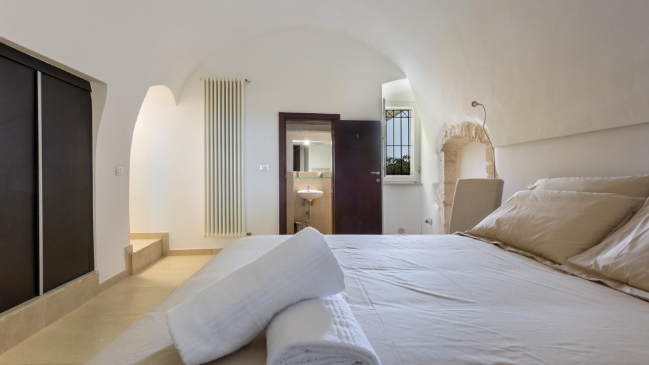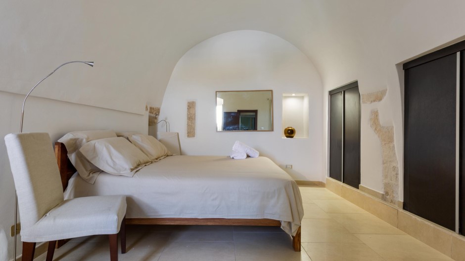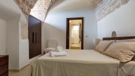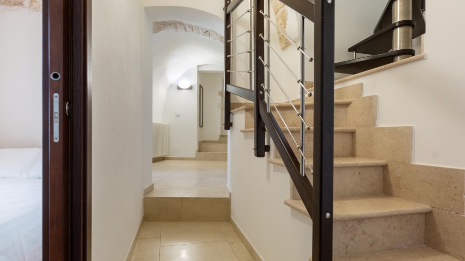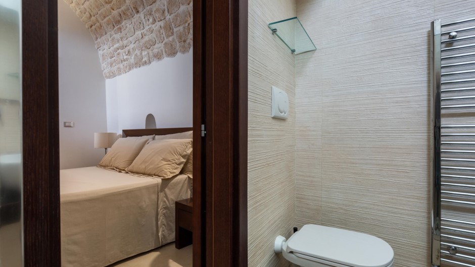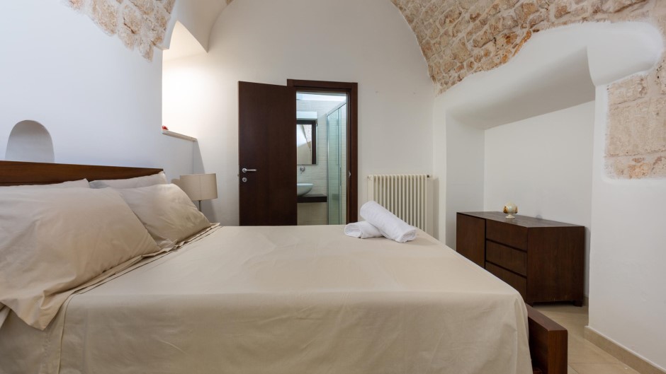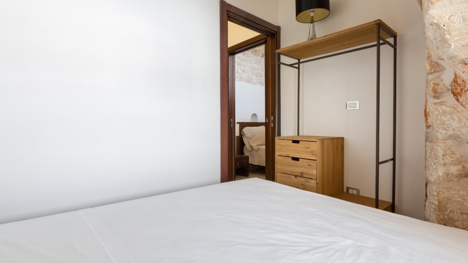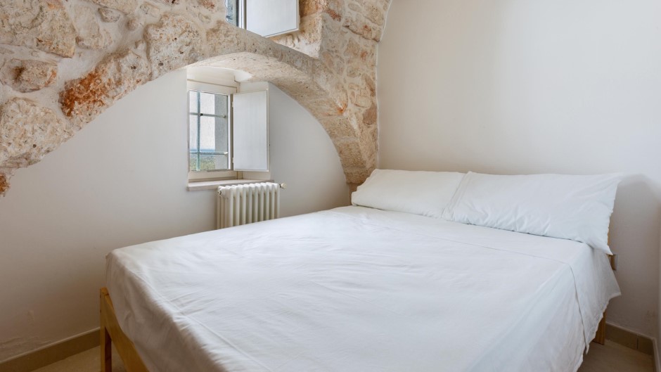 La zona notte, situata al piano inferiore e accessibile tramite una suggestiva scala a chiocciola in legno, è composta da tre camere matrimoniali, due delle quali con bagno privato con doccia. Un secondo ingresso diretto dalle antiche mura aggiunge un tocco di autenticità e carattere a questa struttura unica.