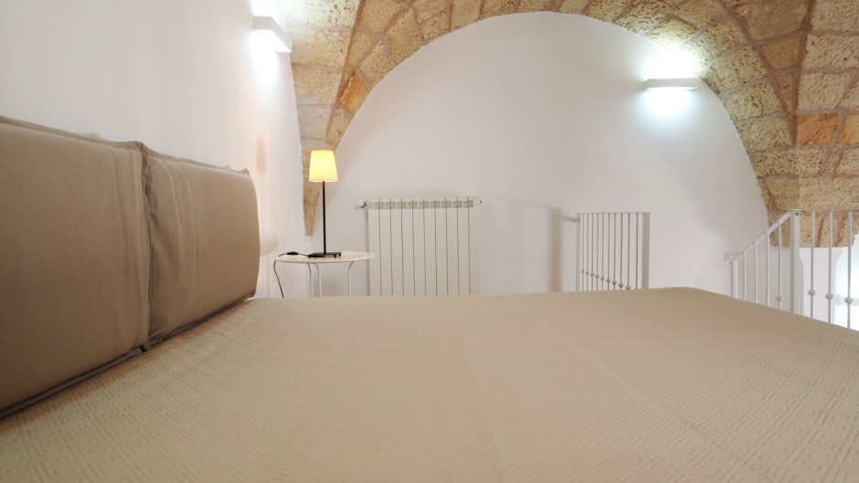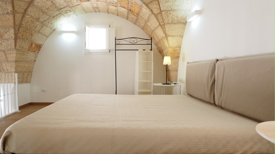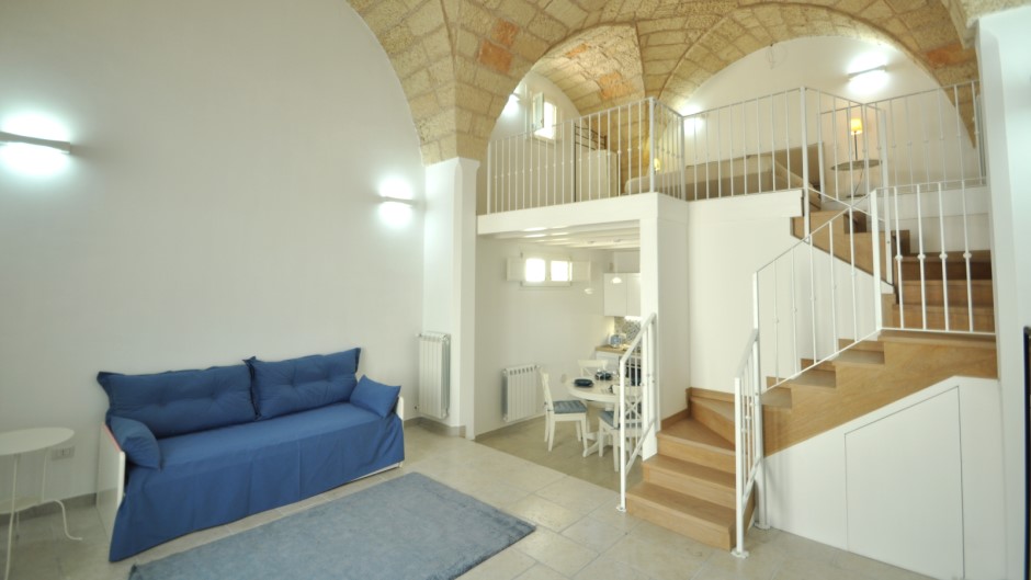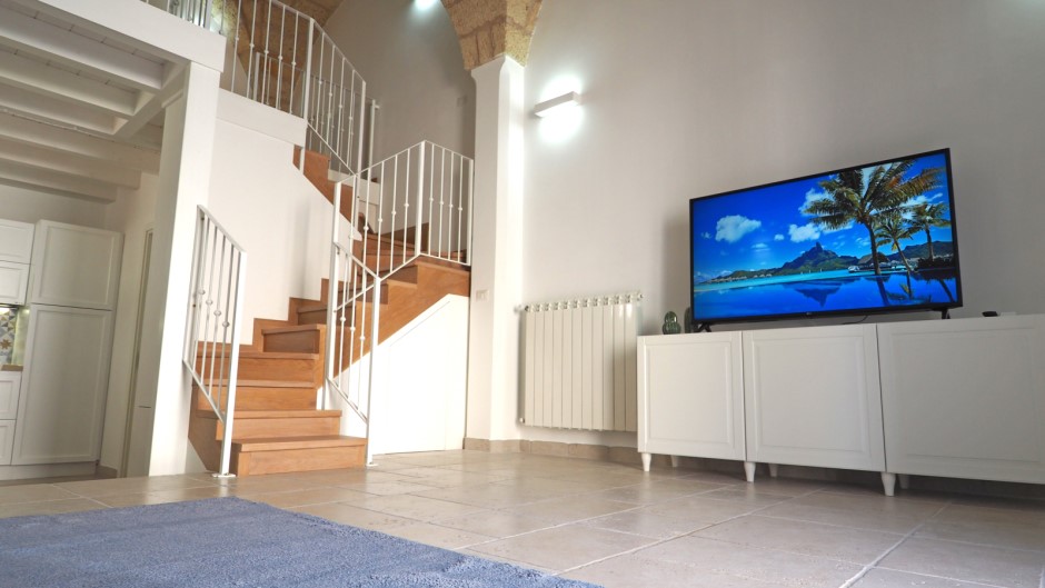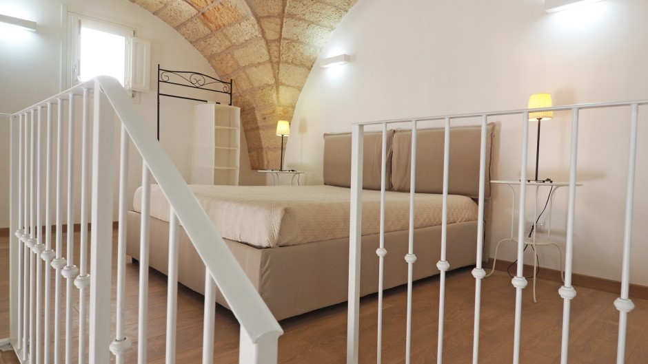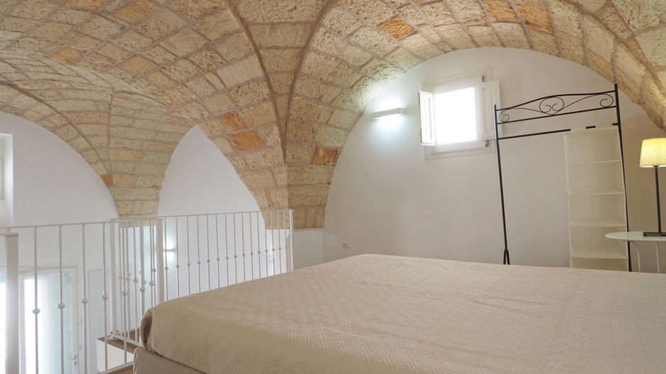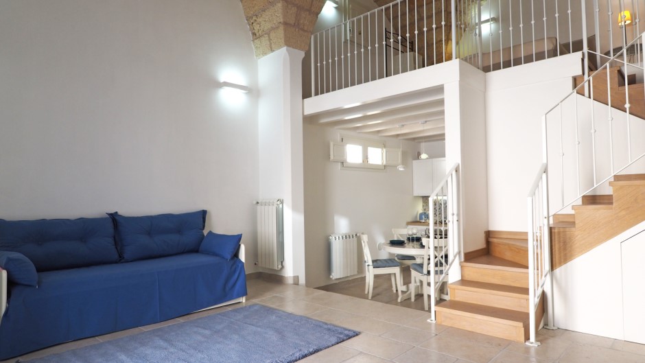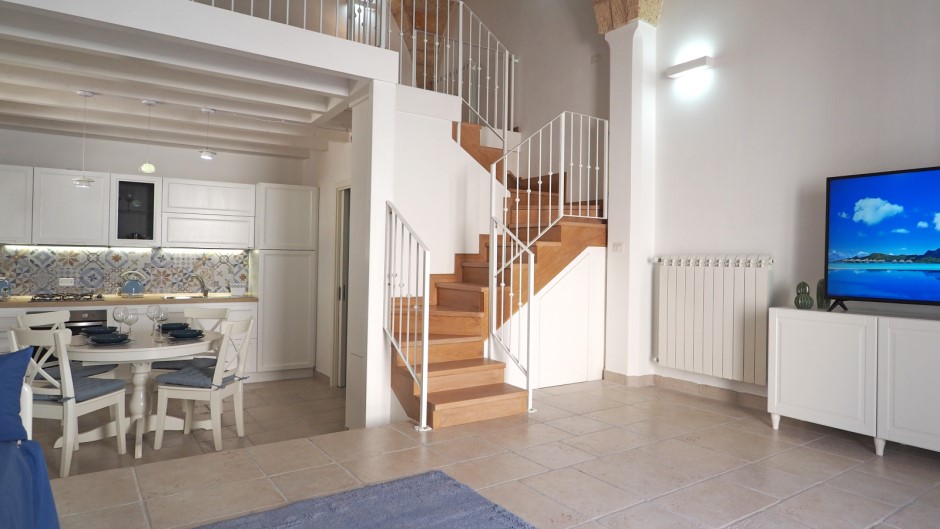 L'ingresso della casa si apre su un'ampia zona giorno con volte a stella a vista e un comodo divano letto matrimoniale, che può essere utilizzato come divano durante il giorno. L'angolo cottura è completamente attrezzato con tutti gli elettrodomestici necessari, incluso un tavolo da pranzo per quattro persone. Una scala in legno conduce alla camera da letto matrimoniale, situata su un soppalco con vista sulla zona giorno. Il bagno completo è dotato di una spaziosa doccia.
