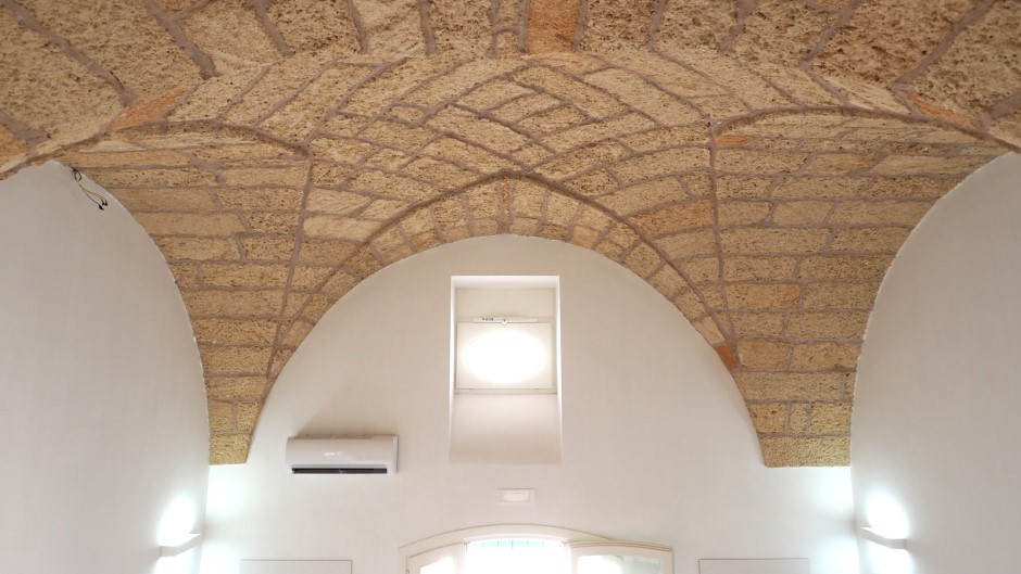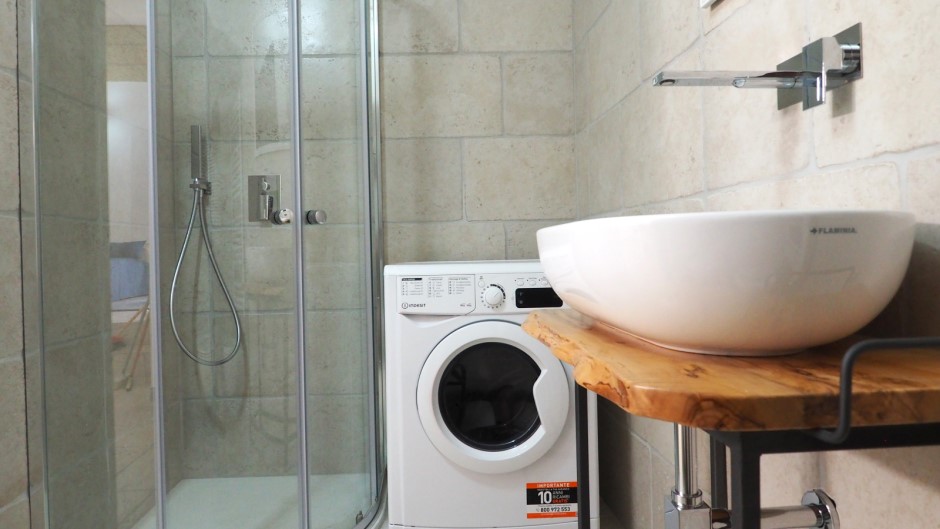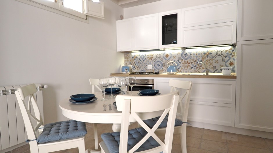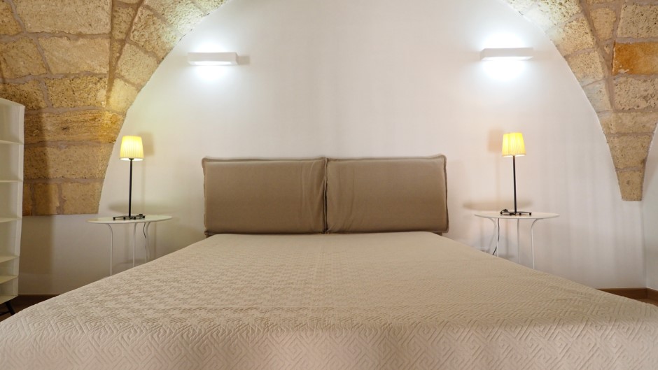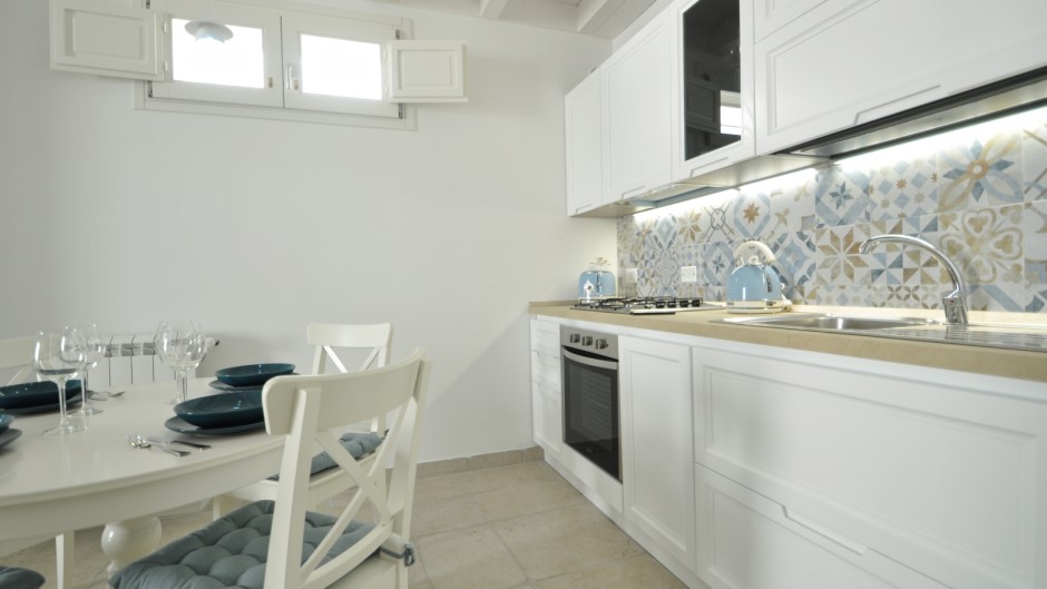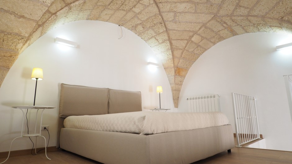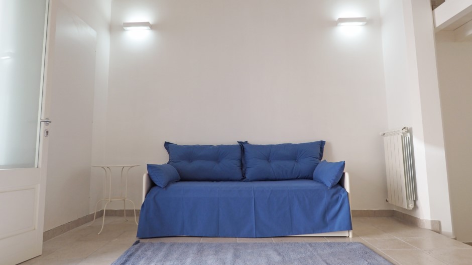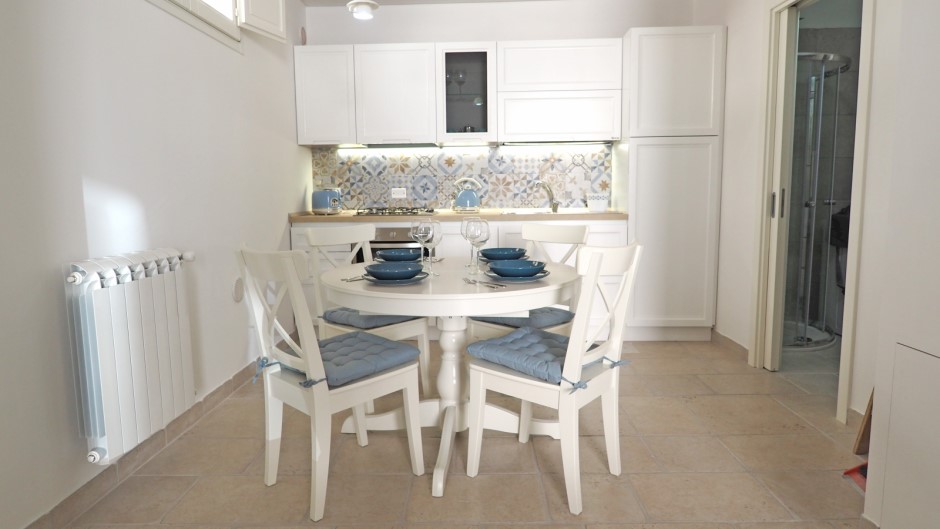 L'ingresso della casa si apre su un'ampia zona giorno con volte a stella a vista e un comodo divano letto matrimoniale, che può essere utilizzato come divano durante il giorno. L'angolo cottura è completamente attrezzato con tutti gli elettrodomestici necessari, incluso un tavolo da pranzo per quattro persone. Una scala in legno conduce alla camera da letto matrimoniale, situata su un soppalco con vista sulla zona giorno. Il bagno completo è dotato di una spaziosa doccia.