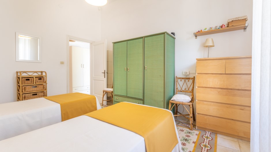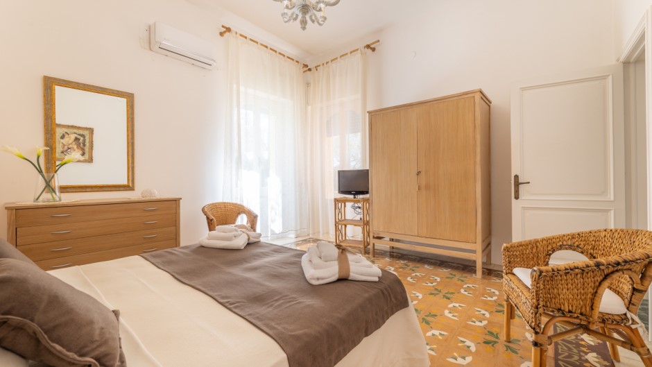 La villa situata al piano terra rialzato dispone di: ingresso, cucina abitabile, grande soggiorno vista mare climatizzato con divano; una camera matrimoniale e una camera doppia, entrambe climatizzate ed un nuovissimo bagno con box doccia. Sul retro una comoda zona servizi con pila esterna, lavatrice e due docce esterne comuni (agli ospiti occupanti il piano inferiore).
