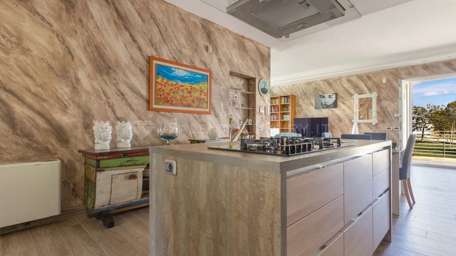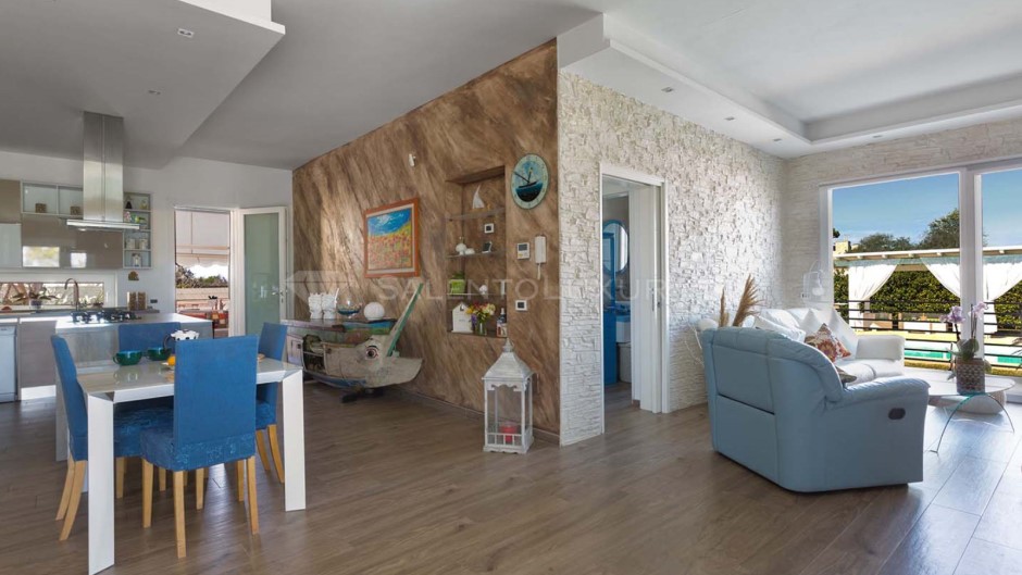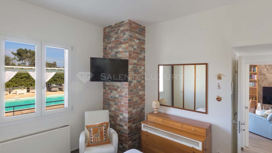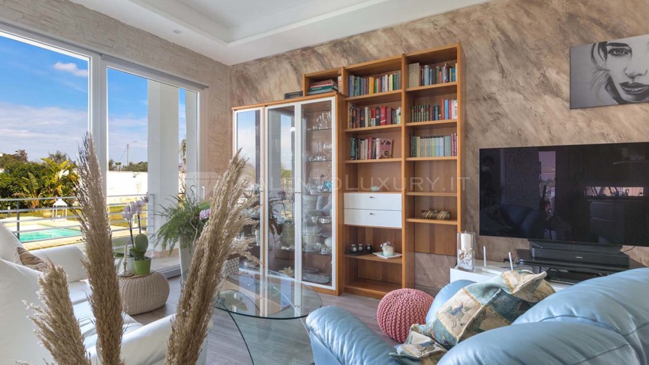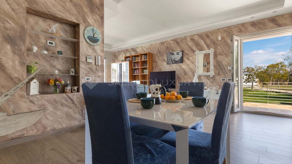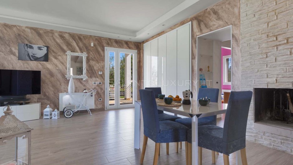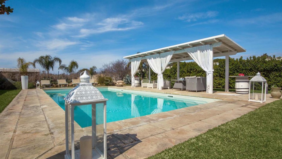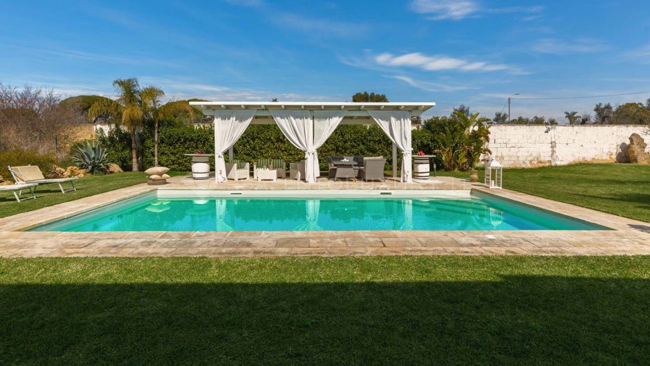 Gli spazi esterni sono molto spaziosi e attrezzati per il relax, come la bellissima piscina con solarium che si apre su un curato prato verde. Ci sono anche due gazebo arredati con salottini perfetti per le giornate dedicate al benessere. La villa ha una spaziosa veranda coperta, sopraelevata di pochi gradini e arredata con divanetto, sedia a dondolo e gondola, dove gli ospiti possono rilassarsi e godere della vista panoramica.