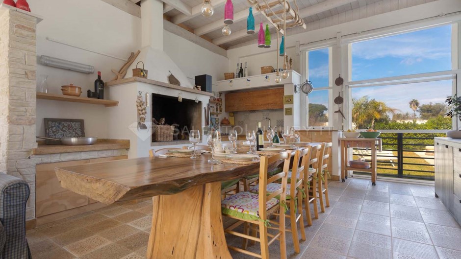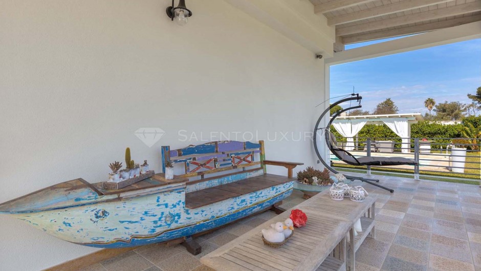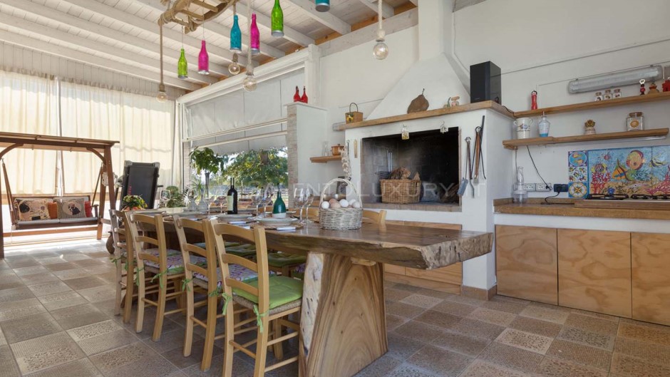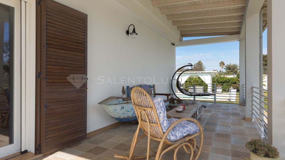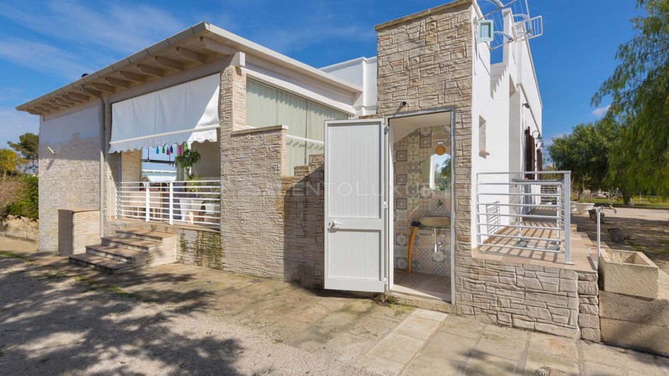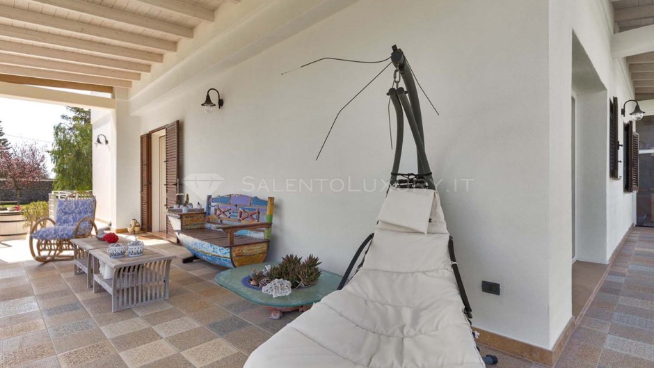 Dalla zona della cucina si accede alla veranda coperta con tettoia in legno, dove si trova un divano letto matrimoniale, angolo cottura e sala da pranzo. La villa è accessibile attraverso un grande cancello che porta sia alla villa che al resto del giardino dove si trovano i parcheggi per le auto, tanto verde, un bagno esterno con lavabo e WC, una doccia esterna e i recinti per gli animali della tenuta.