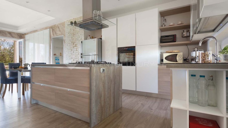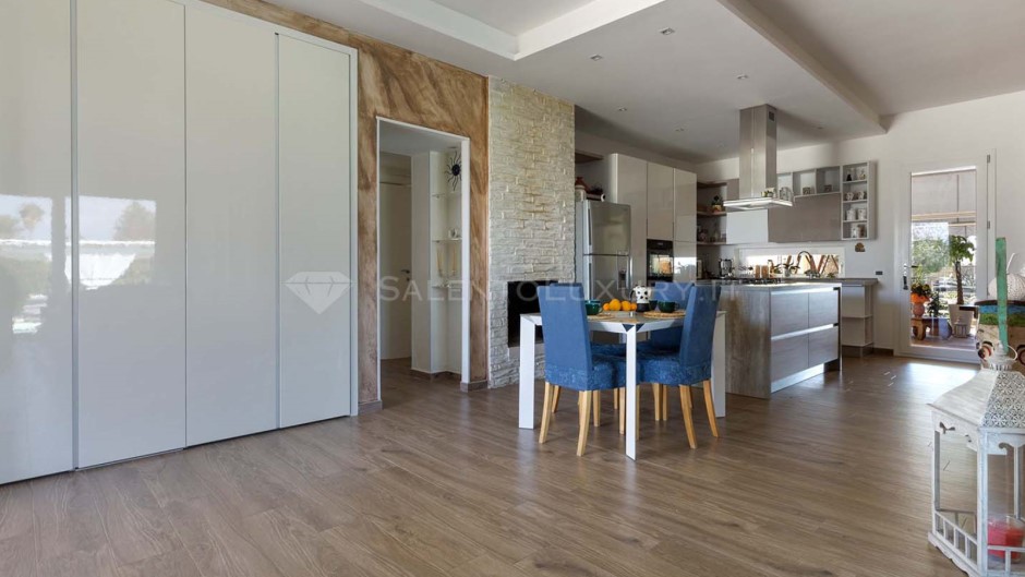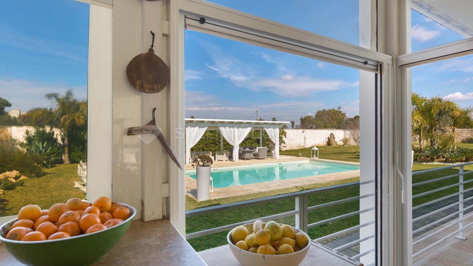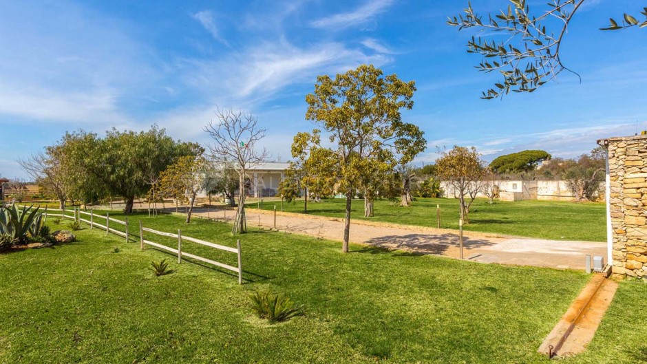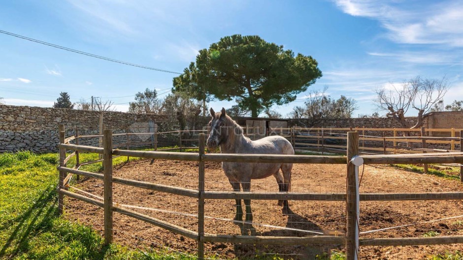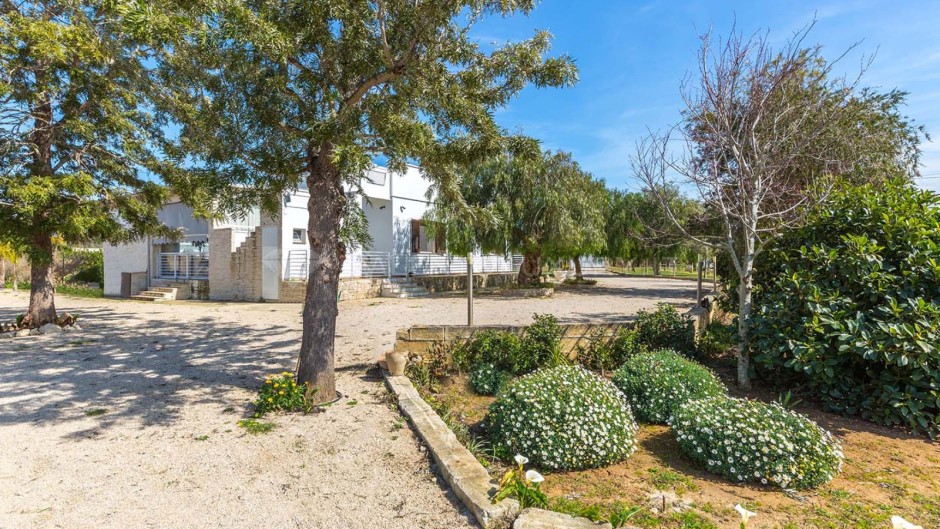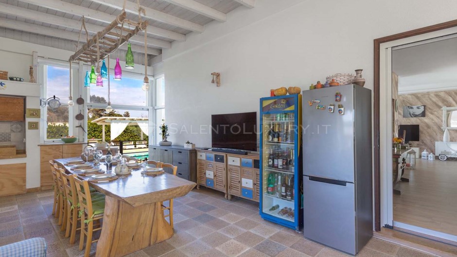 Dalla zona della cucina si accede alla veranda coperta con tettoia in legno, dove si trova un divano letto matrimoniale, angolo cottura e sala da pranzo. La villa è accessibile attraverso un grande cancello che porta sia alla villa che al resto del giardino dove si trovano i parcheggi per le auto, tanto verde, un bagno esterno con lavabo e WC, una doccia esterna e i recinti per gli animali della tenuta.