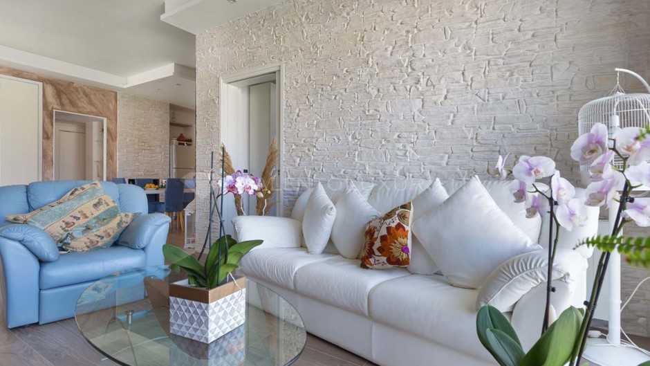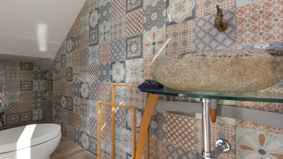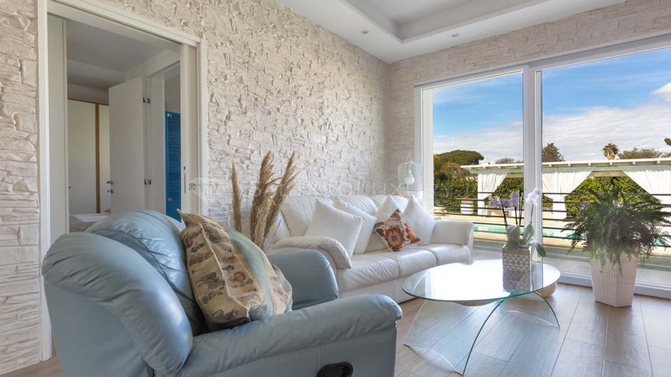 Gli interni della villa sono accoglienti, luminosi e spaziosi, con un'ampia zona open space che comprende sala da pranzo accanto al caminetto, salotto con libreria e TV, cucina moderna e ben equipaggiata con isola. Ci sono 3 camere da letto, una camera matrimoniale con bagno doccia en suite, una camera doppia con TV e una camera alla francese con TV. C'è anche un bagno doccia completo.