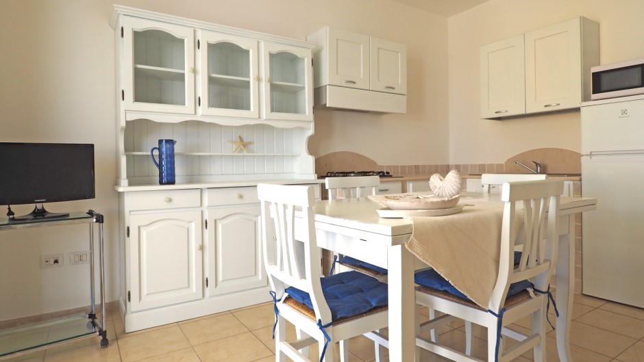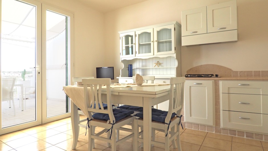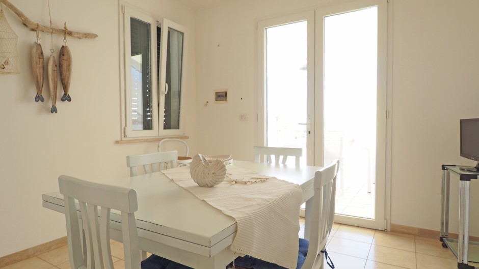 La villa dispone anche di una luminosa sala pranzo con angolo cottura completamente attrezzato, anche se senza forno. Tuttavia, la vera protagonista della Villa del Mare 1 è la grande veranda esterna, perfetta per pranzi e cene all'aperto, grazie alla presenza di mobili da giardino. Gli ospiti possono godere della brezza marina e ammirare il bellissimo paesaggio circostante, sorseggiando un bicchiere di vino o gustando i piatti tipici della cucina pugliese.