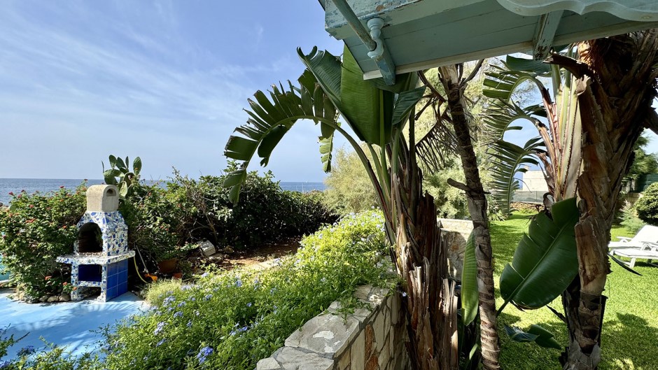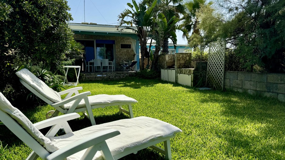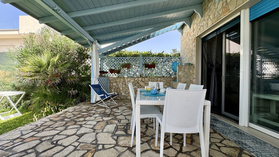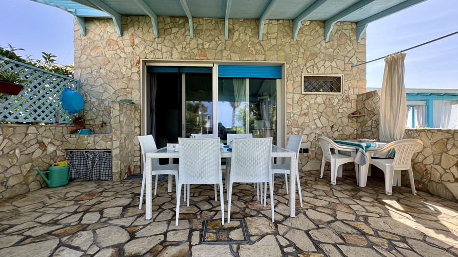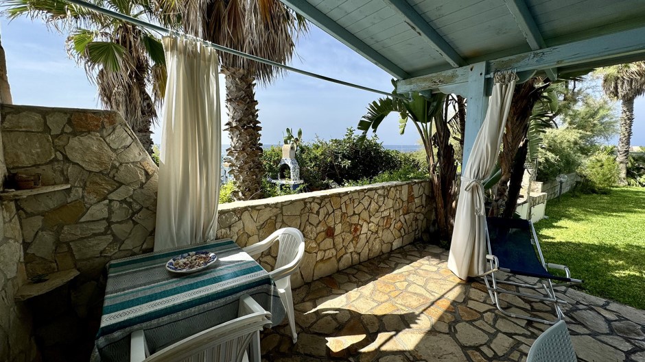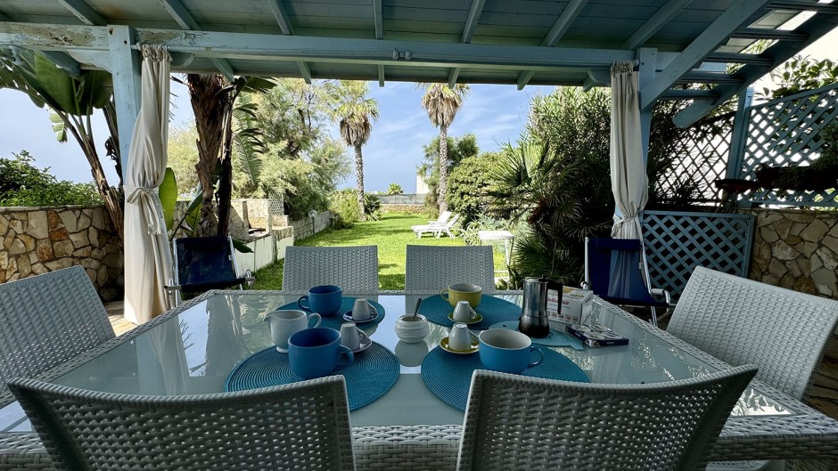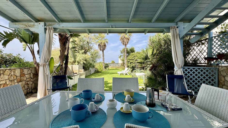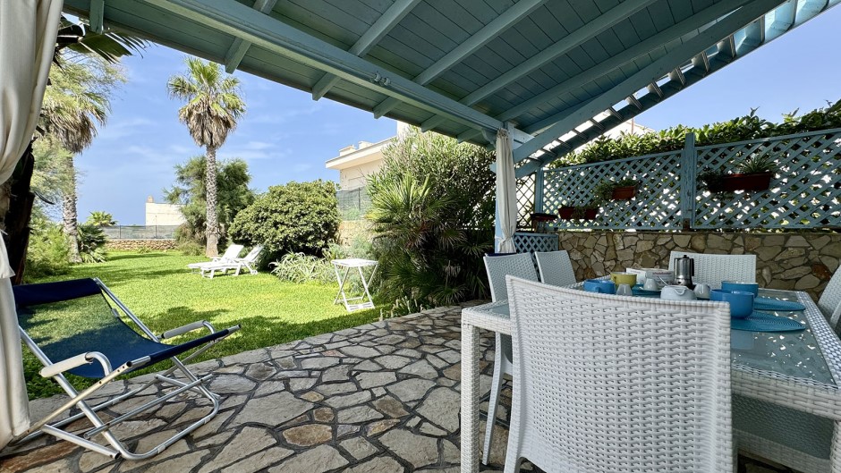 La villa dispone di una veranda esterna, dove potrete godervi tranquille colazioni al mattino o rilassarvi con un aperitivo al tramonto, accompagnati dal dolce suono delle onde. Un giardino attrezzato con comodi arredi offre un ambiente ideale per prendere il sole o ammirare i magnifici tramonti sulla costa.